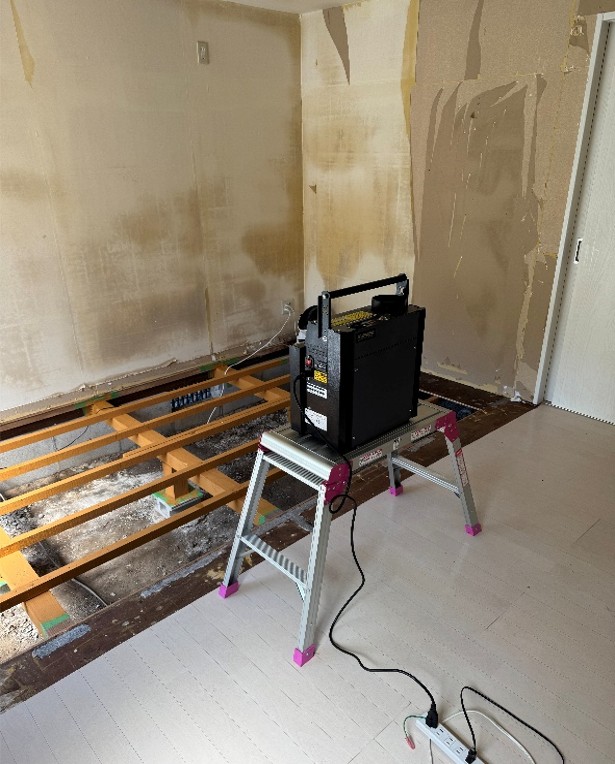 ご遺族の方から特殊清掃のご依頼をいただき、前回は室内全体の洗浄と床材の撤去・下処理(コーティング)を行いました。今回はその続きとして、最終的な消臭処理を実施しました。