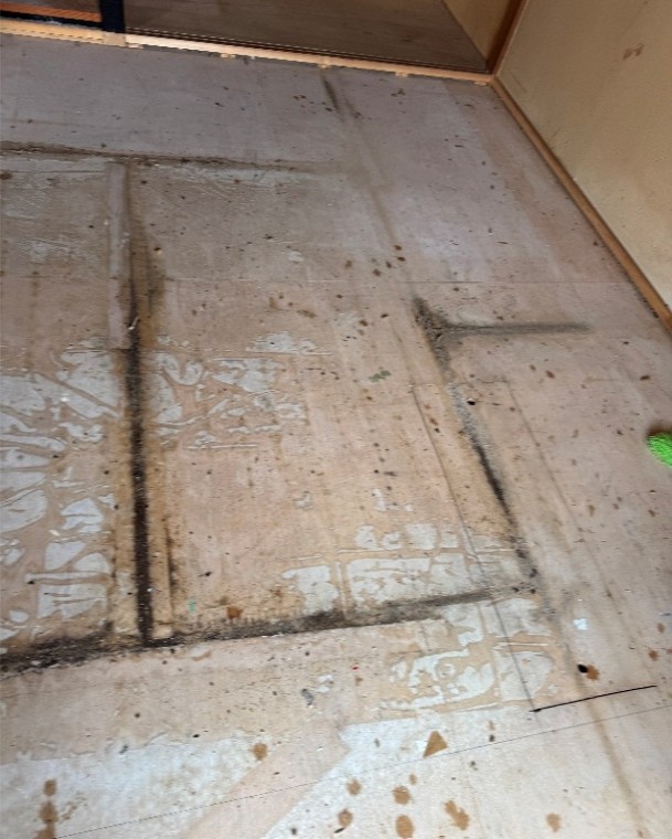 具体的には、カビの除去や畳の撤去を中心に作業を行いました。畳を外した際、黒ずんだ汚れが床板に残っていましたが、特殊清掃で使用する薬剤を活用し、床板まで丁寧に洗浄しました。経年劣化による一部の汚損は残ったものの、清掃後は売却に向けた状態に改善できました。