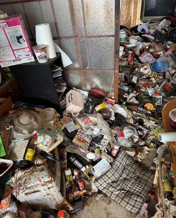 室内は長期間にわたり生活物が蓄積された状態で、室内環境の改善と消臭を目的とした特殊清掃が必要な状況でした。作業では、まず家財や不要物の撤去を行い、臭気の発生源を特定したうえで段階的に対応しました。